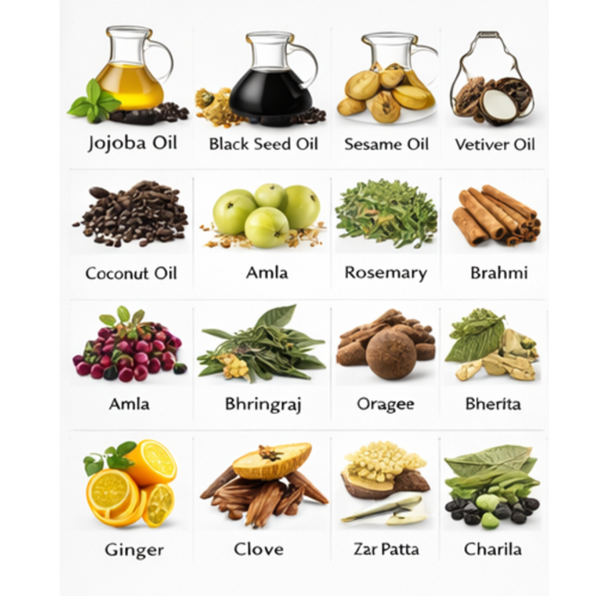 Jojoba Oil, Black Seed Oil, Sesame Oil, Coconut Oil, Vetiver Oil, Amla, Bhringraj, Rosemary, Brahmi, Ginger, Clove, Cinnamon, Tez Patta, Charila & botanical herbal extracts.